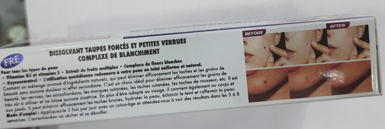 به طور موثر لکه ها و خال ها را بدون هیچ گونه درد یا عوارض جانبی از بین ببرید. این یک انتخاب ایده آل برای از بین بردن موثر خال ها، زگیل ها، برچسب های پوستی، لک های پوستی، لکه های پوستی، کک و مک و غیره است. استفاده از آن بسیار ایمن است و هیچ جای زخمی بر جای نمی گذارد. علاوه بر این که برای صورت مناسب است، برای بدن و پا نیز مناسب است. می تواند به طور موثر لکه های تیره را روشن کند، پوست را مرطوب کند، رنگ چهره را روشن کند و پوست را سفت کند.