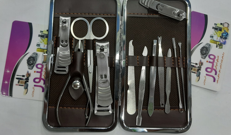 ناخن گیر کوچک مخصوص دست، ناخن گیر بزرگ مخصوص پا قیچی سر منحنی، گوشت گیر، سوهان ناخن، موچین انبری ابزار تمیز کردن زیر ناخن، پوشر ابزار تمیز کردن گوشت ها و پوسته های دور ناخن ابزار تمیز کردن پوسته های روی ناخن
