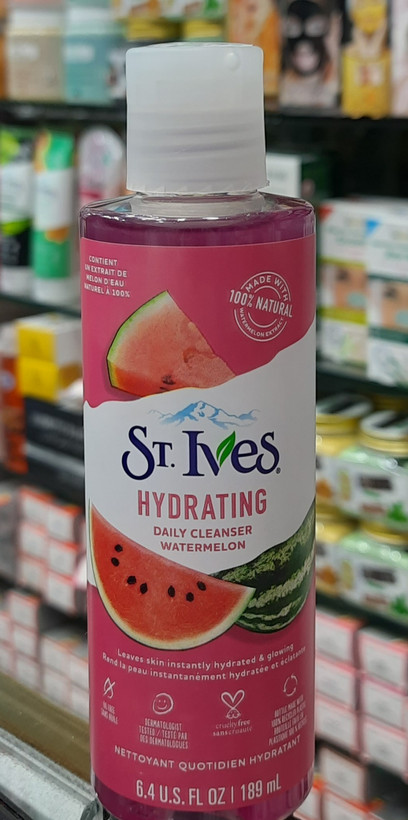 ژل شوینده صورت هندوانه استیوز St Ives Hydrating حاوی عصاره 100 درصد طبیعی هندوانه با خواص آبرسانی و شاداب کنندگی پوست است و برای پاک کنندگی روزانه آلودگی، ناخالصی ها و چربی اضافی پوست مناسب می باشد. ژل شوینده سینت ایوز دارای فرمول ملایم با پوست است و ضمن احیای تمیزی پوست، پوستی رطوبت رسانی شده، لطیف و درخشان را به ارمغان می آورد. این ترکیب بدون پارابن و تست شده توسط متخصصین پوست است.